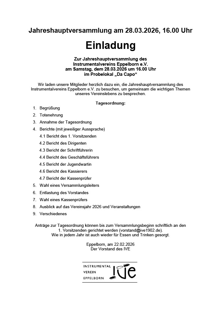 Der Instrumentalverein Eppelborn lädt alle Mitglieder herzlich zur diesjährigen Jahreshauptversammlung am 28.03.2026 um 16:00Uhr im DaCapo ein. Neben den Berichten des Vorstandes werfen wir gemeinsam einen Blick auf das vergangene Vereinsjahr und geben einen Ausblick auf kommende Aktivitäten. Wir freuen uns über eine rege Teilnahme und einen schönen gemeinsamen Austausch.